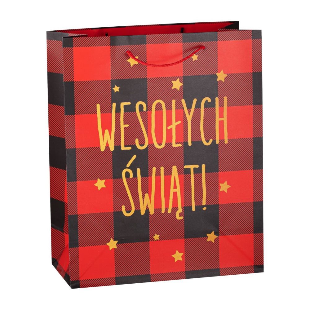 Torebka świąteczna w kolorze czerwonym, z wzorem koszuli w kratę i napisem Wesołych Świąt.