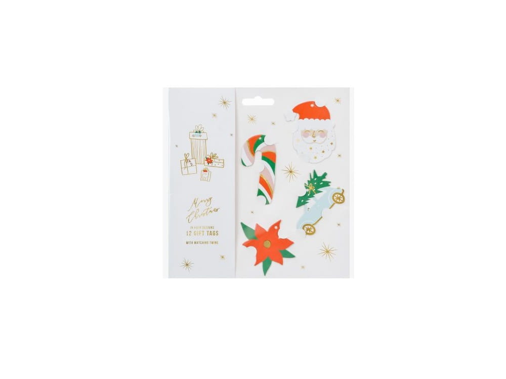 Zawieszki do prezentów Mikołaj wykonane z papieru, mix wzorów i kolorów. Zestaw zawiera 12 zawieszek (4 wzory, po 3 szt. z każdego wzoru) i 2.5 m złotego sznurka. Wymiary zawieszek ok. 4-7 x 5-7.5 cm.